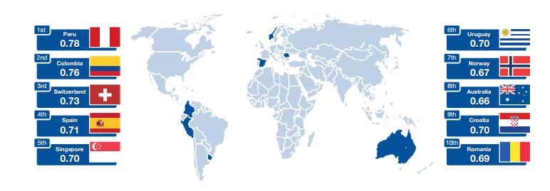 Basándose en los aspectos anteriores, el Informe arroja un “Top Ten” Las diez mejores economías, que son: Perú, Colombia, Suiza, España, Singapur, Uruguay, Noruega, Australia, Croacia y Rumanía, en ese orden. En el Informe se destaca que todos estos países tienen un programa de eficiencia energética claramente definido, así como medidas de política energética en sus territorios. En cuarta posición se encuentra España.